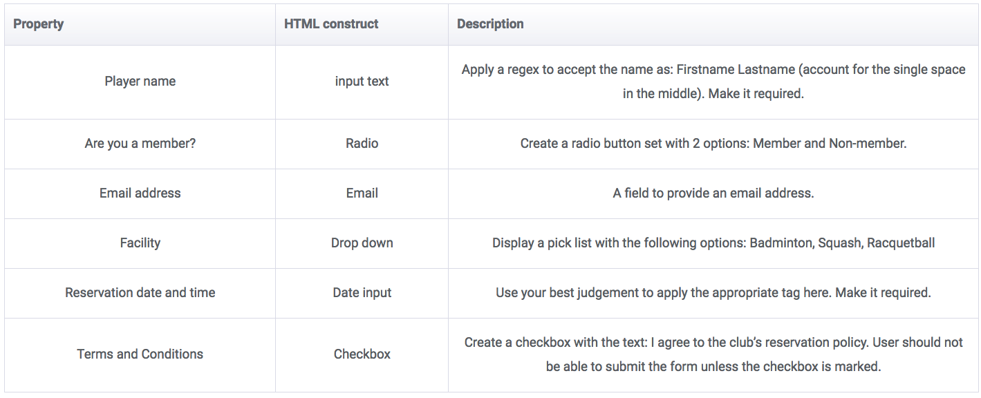 Create a simple form for a local fitness club to reserve courts. Use the template provided at the end of this block to get started. Ignore the CSS rules for now; adding HTML elements will automatically apply some styles but feel free to edit them. Add the following elements to the form:
